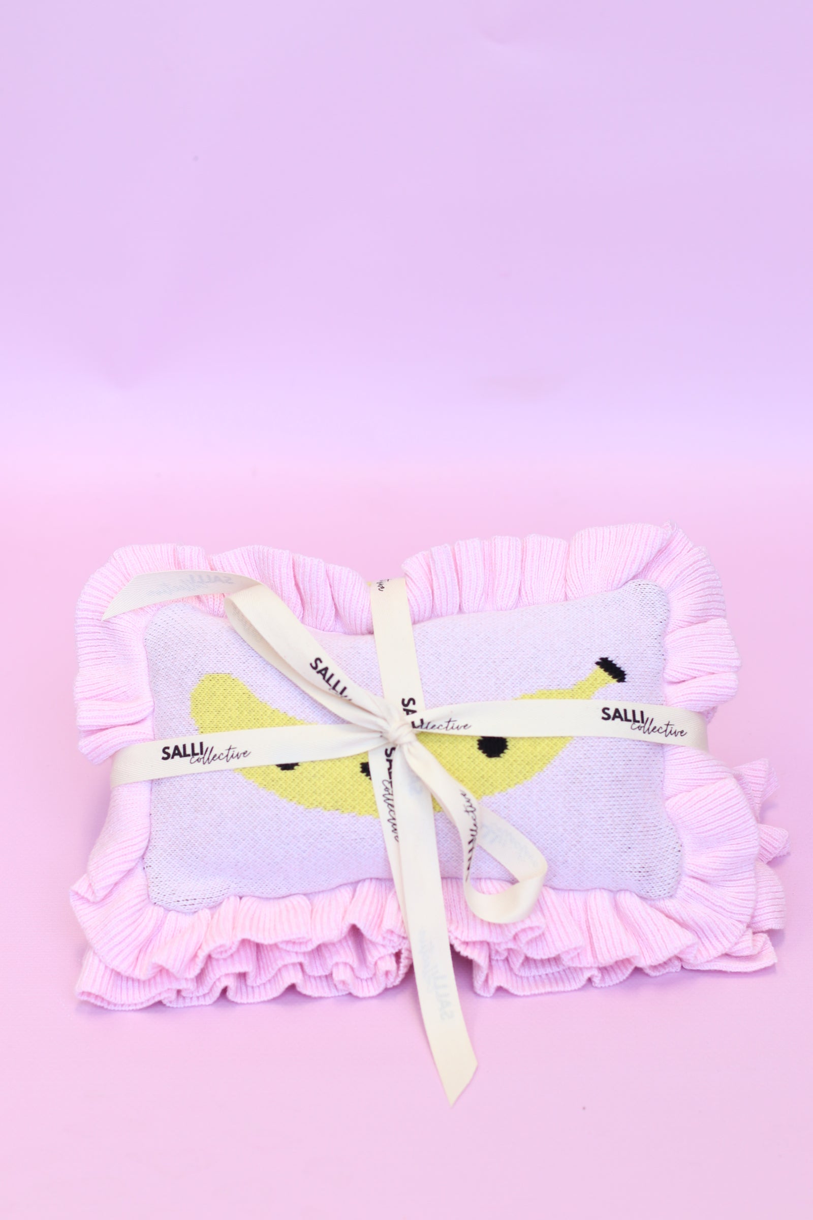 Your little ones will adore wrapping their toys and dolls in timeless charm with our Luxury smilie banana Blanket & Pillow Set beautiful hues of pink and yellow. Beautifully crafted from 100% pure cotton, this soft knit set is breathable, gentle, and luxuriously smooth to the touch.